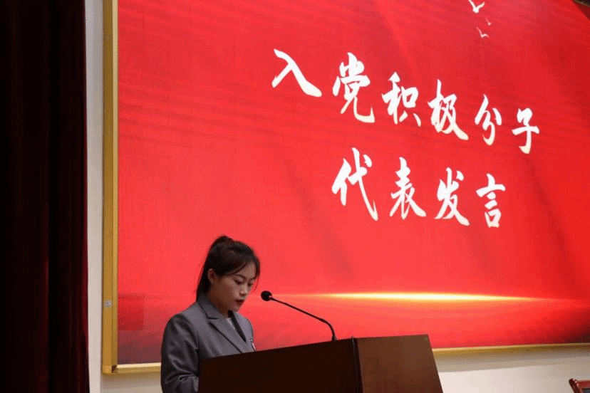 入党积极分子代表22级高职舞蹈表演(体育舞蹈)2201班级肖博文同学表态发言,她表示要时刻以一个党员的标准要求自己,努力认真学习党的相关知识,积极向党组织靠拢,把自己锻炼成符合党和人民期望的社会主义建设者和接班人。