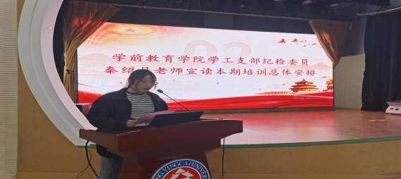 会议伊始,学前教育学院学工支部纪检委员秦绍月老师向全体学员宣读了本次培训方案以及培训班的纪律要求,要求学员们在培训期间要遵守纪律,认真学习。