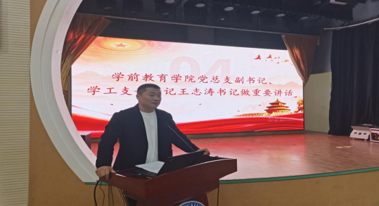 学前教育学员党总支副书记、学工支部书记王志涛发表讲话,王书记首先对全体学员表示热烈的祝贺,表达了期望,并要求全体学员要深刻理解领会举办本次培训班的意义,明确入党动机、端正入党态度、积极学习、积极工作,做到学有所思、学有所获、学有所成、知行合一,争取早日加入中国共产党。