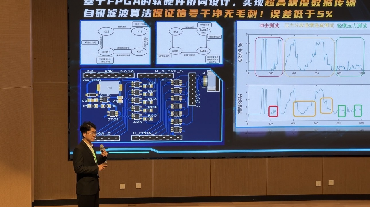 10月18日,决赛正式打响。工学院作为必赢bwin线路检测中心的唯一代表队,由辅导员贾楠老师带队,携刘秀成、王文康、董鑫源等学生共同研发的项目《有“感”有得--超柔性智能电子皮肤引领者》亮相赛场。该项目凭借其独特的创意、先进的技术和广泛的应用前景,在众多参赛作品中脱颖而出,荣获高职学生组二等奖。