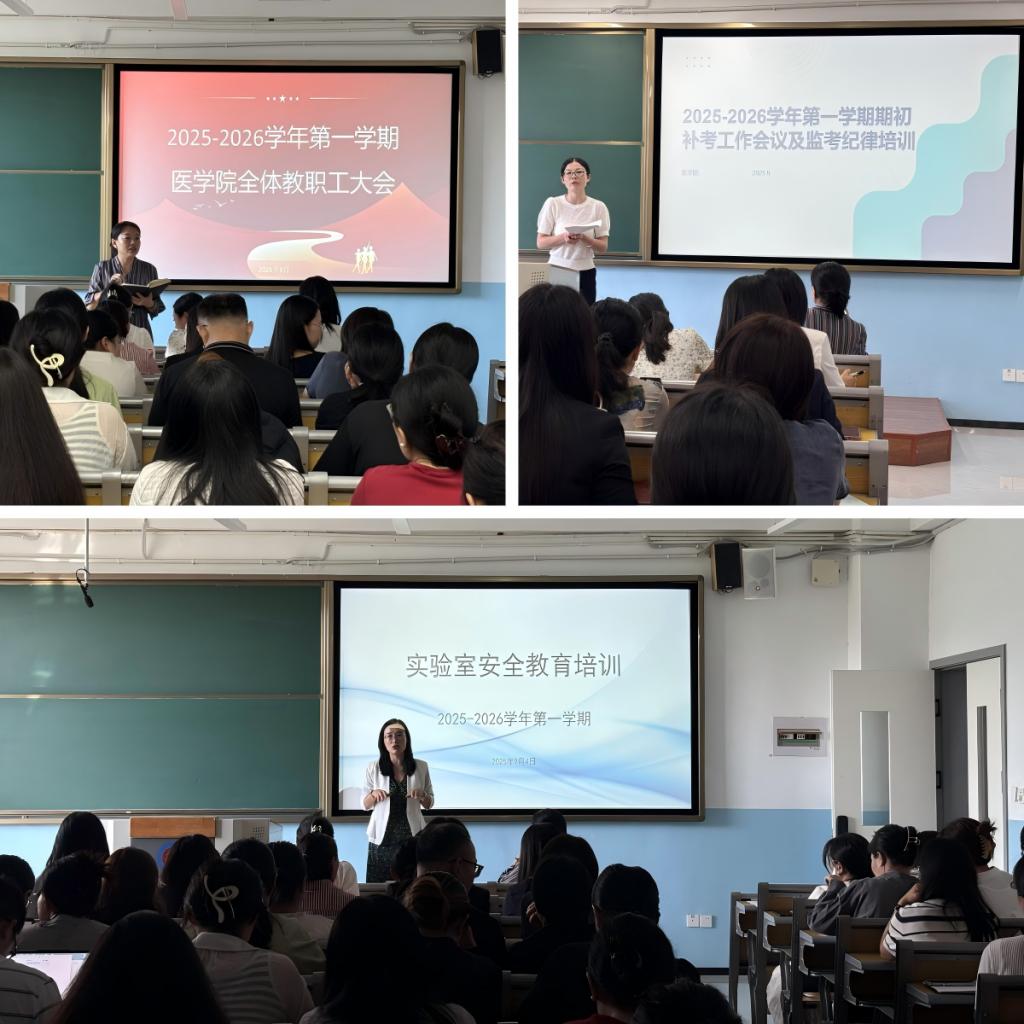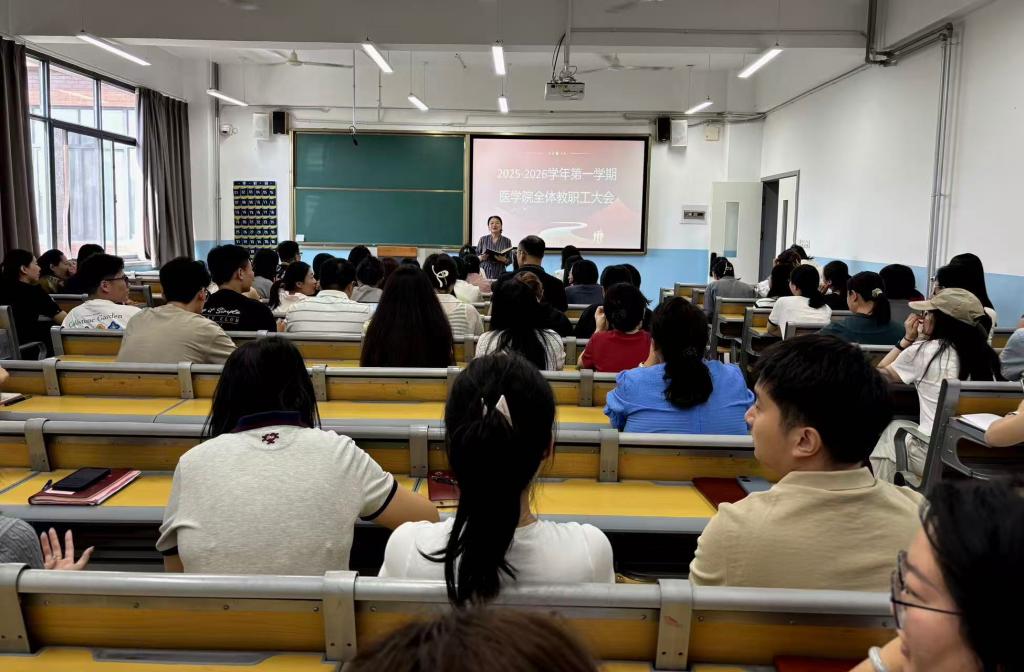 为明确新学期工作方向,凝聚全体教职工力量,确保本学期各项工作有序开展,2025年9月4日上午,医学院在医学院楼208隆重召开学期初全体教职工大会,会议由王曼老师主持,全体教职工参加会议。