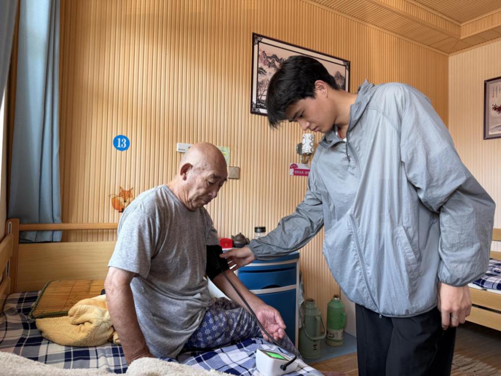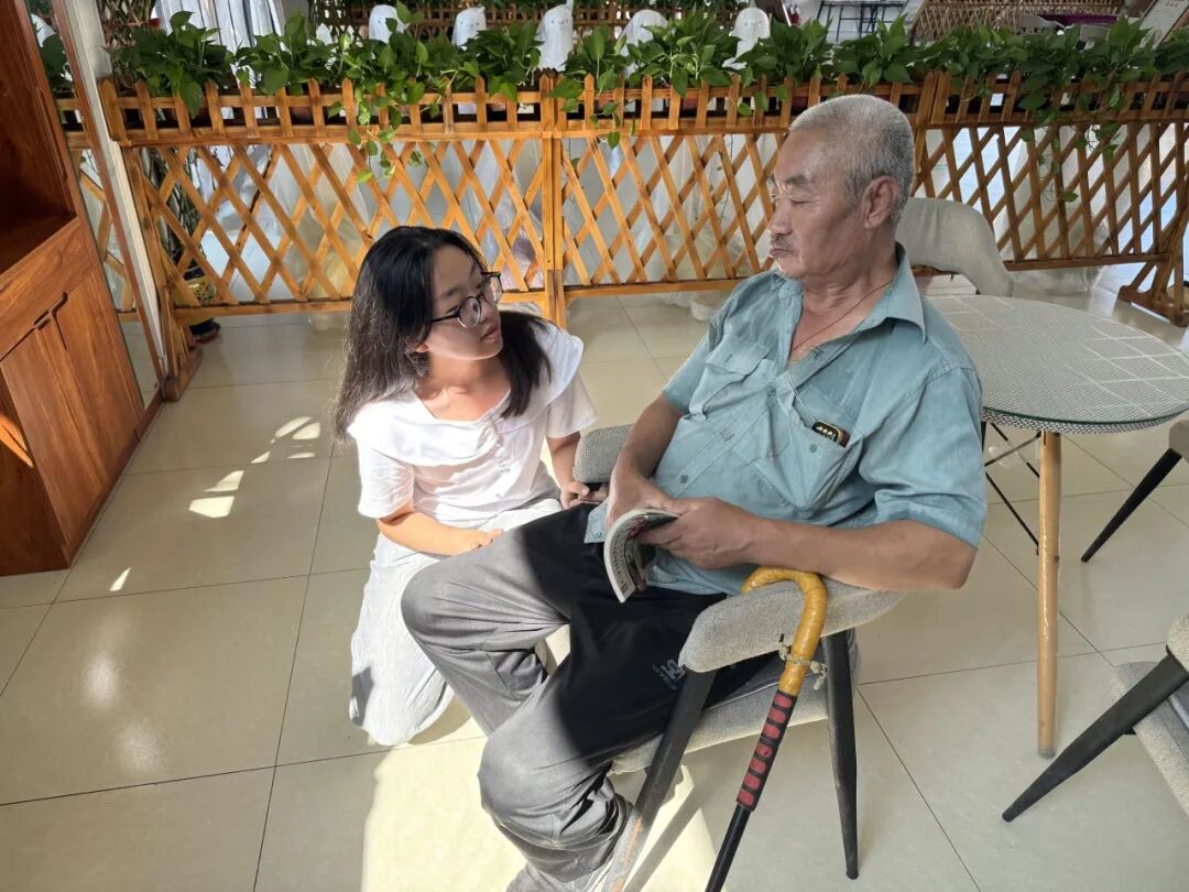 在养老机构的房间里,暖光轻柔笼罩。“守望相助” 实践团的成员们俯身向前,眼神专注地调试血压仪。成员在老人身旁唠起家常,从节气变化叮嘱添衣,到倾听老人讲过去的故事,笑声在房间里回荡。不知不觉间,血压测量已顺利完成,成员仔细记下数据,还耐心讲解注意事项。这场充满暖意的互动,不仅为老人送去了健康关怀,更让实践团成员在亲身体验中深化了对“尊老敬老”的理解。