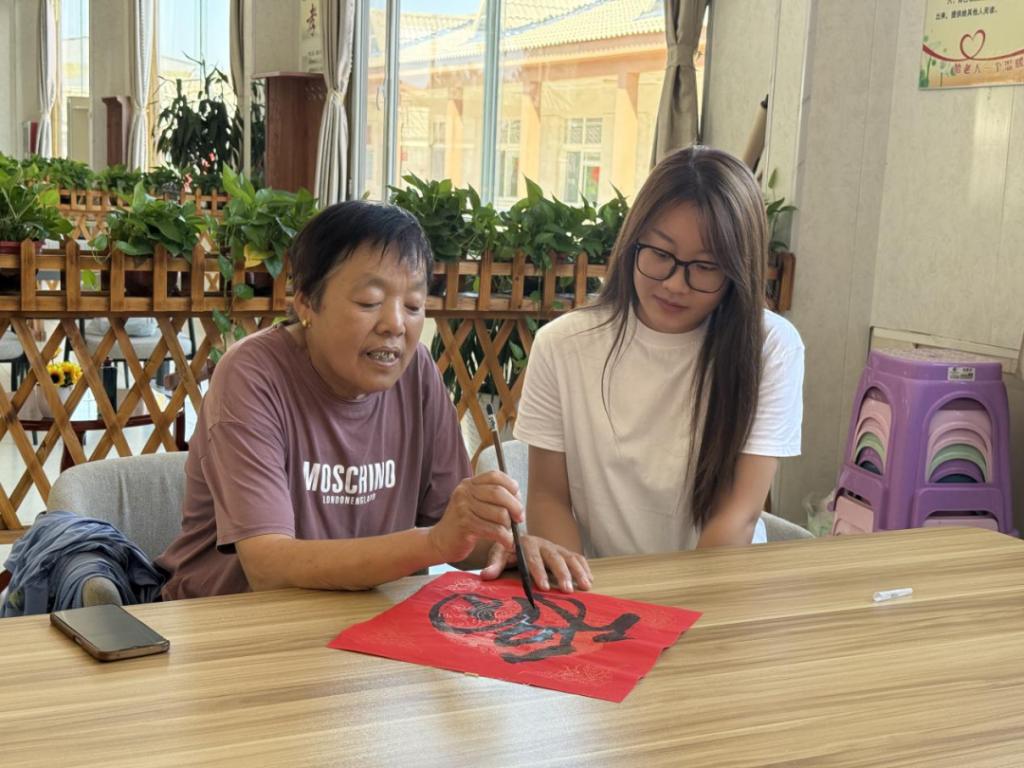 在养老院的活动室内,“守望相助” 实践团巧妙将养老关怀与中华传统文化相融合。成员们或与老人并肩站在书桌前,教老人握笔运墨,共书 “福”;或围在象棋桌旁,陪老人楚河汉界间对弈。不仅搭建起文化交融与心灵沟通的桥梁,更用行动书写着青年服务老人、爱心献给老人的温暖篇章。