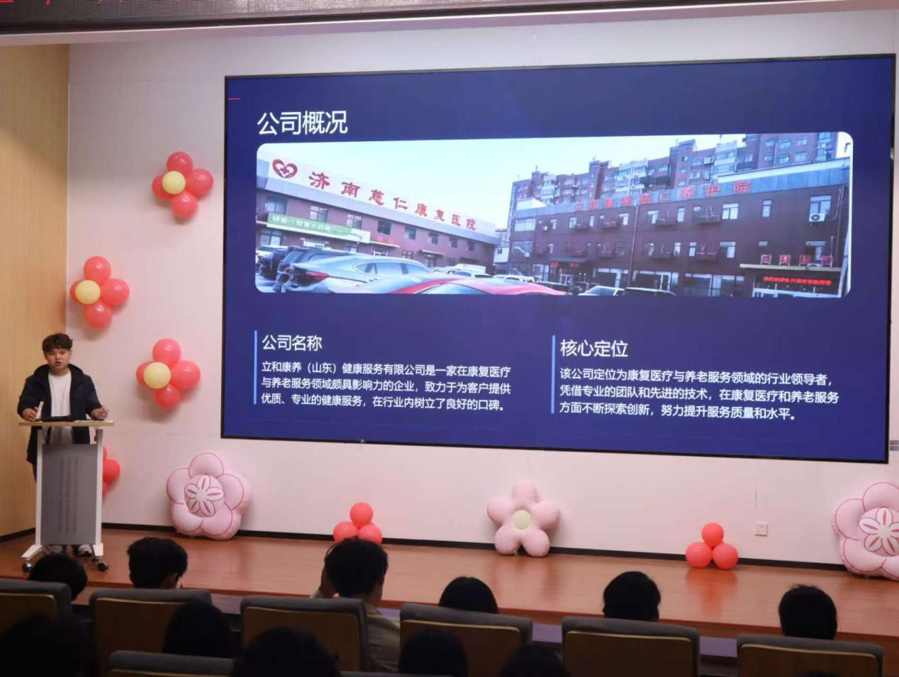 宣讲会上,高德胜以“校友+企业骨干”双重身份展开分享。他结合在校经历回忆:2019年赴台湾弘光科技大学交流深化专业认知,2020年任医学院理疗馆负责人积累实践经验,主持科研项目锤炼学术思维,这些校园积淀为职场发展筑牢根基。随后,他聚焦立和康养(山东)健康服务有限公司的发展与优势展开解析:作为康复医疗与养老服务标杆企业,其历经2019年家护起步、2020年“医疗+养老”拓展、2024年多机构扩张、近年创新升级四大阶段,核心业务涵盖康复医疗、养老服务、医养智慧化管理,以“团队合作、创新精神、患者至上”理念领跑行业。同时,他还解读企业用人标准,梳理学术深造、考公考编、中医师承三类职业路径,并详解“五险一金”职场保障,为学子答疑解惑。