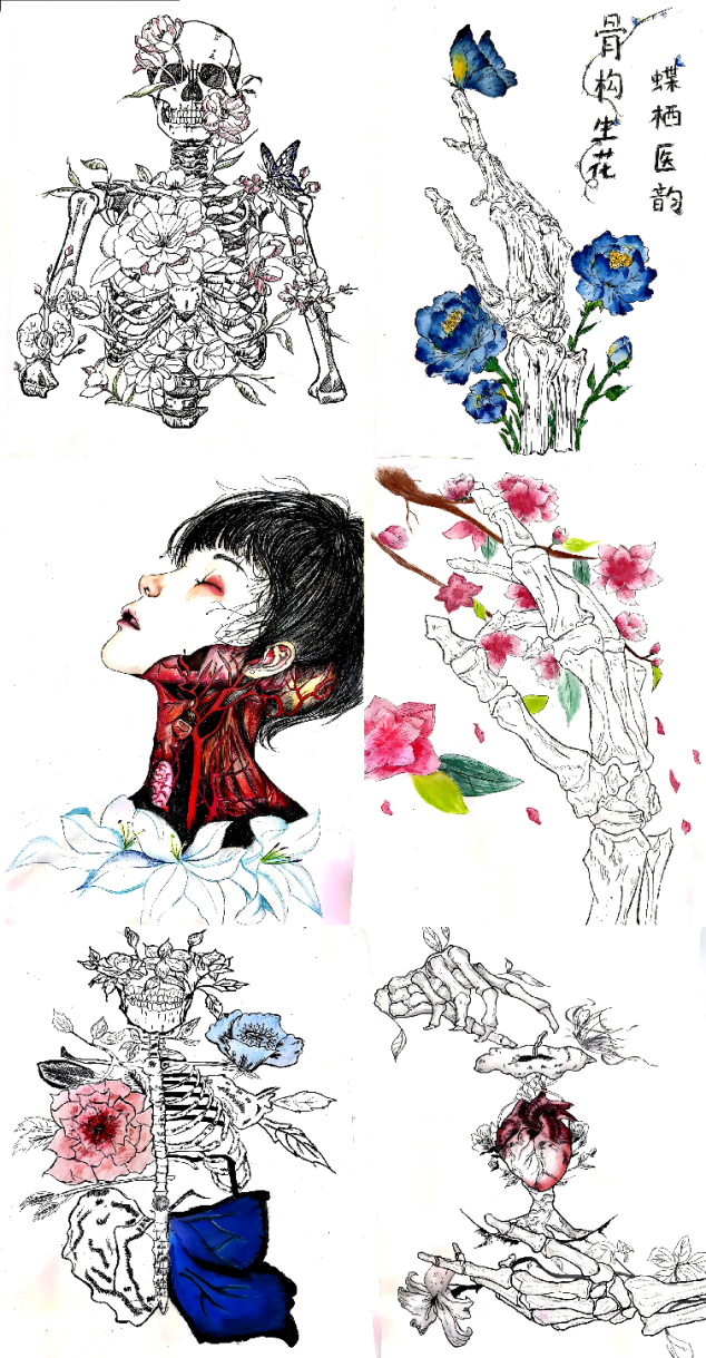 前期征集的百余幅绘画作品经过解剖学专业老师的评审,22个作品脱颖而出,进入最后评奖环节。所有作品在医学院大厅LED屏幕滚动播放。作品中,有以细腻线条勾勒血管、骨骼的写实画作,也有结合生活场景传递健康理念的创意设计。