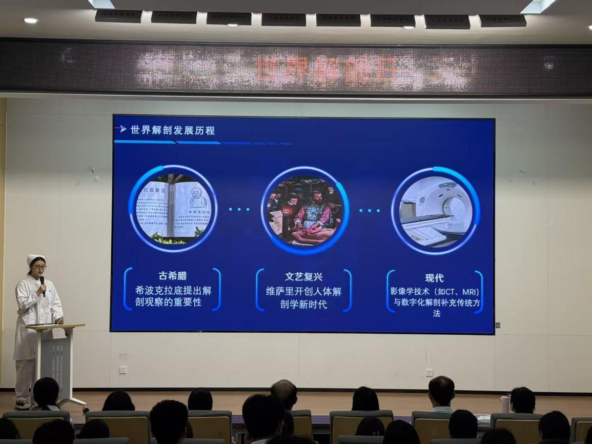 10:10,师生移步报告厅。本科护理学2403班的魏睦欣同学作《探索生命奥秘,拥抱健康未来》主题报告,3分钟动画串联维萨里、达尔文、数字人技术,现场3次响起自发掌声。报告指出:“解剖学不仅是技术,更是人文——每一把手术刀背后都站着一位老师。”