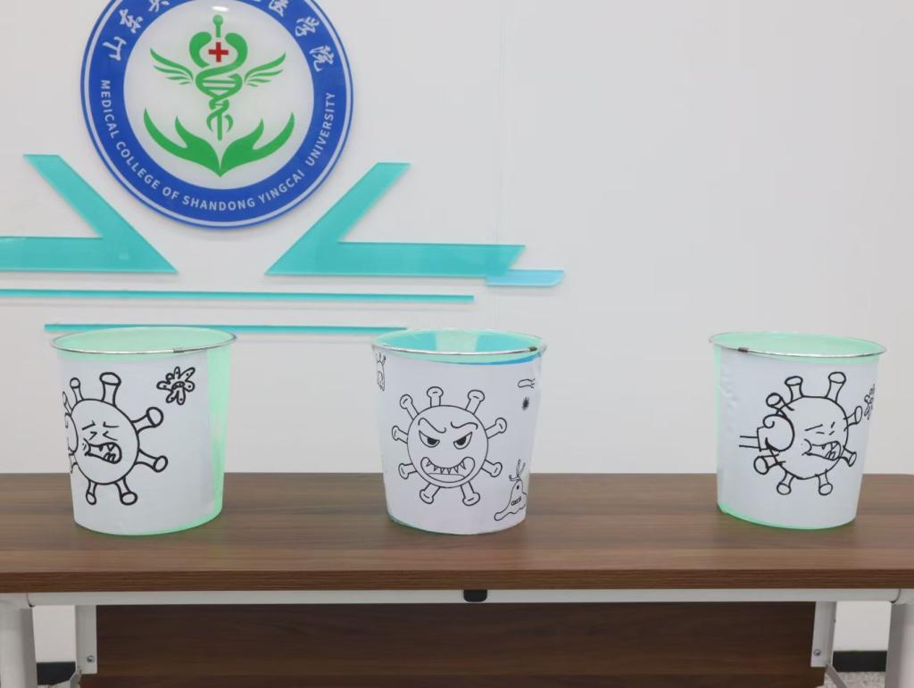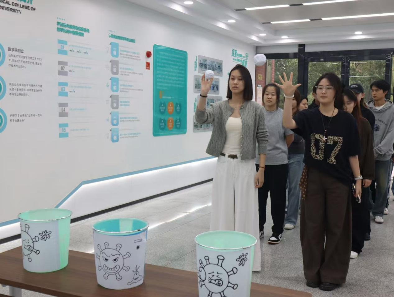 “细菌怪兽”保龄球游戏创意十足,桶上画上“细菌”表情化身“怪兽”,它将抽象的医学知识转化为一场充满想象力与竞技乐趣的实战。 让同学们在 互动中,深刻领悟到手部卫生作为“第一道健康防线”在阻断病原体传播中的关键作用。