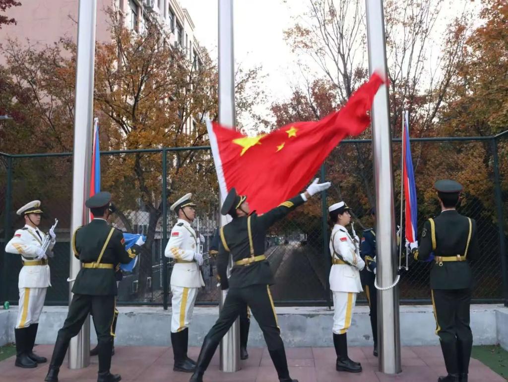 晨光熹微,全体师生着装整齐、精神饱满,有序列队。兄弟连国旗中队迈着铿锵步伐护送国旗入场,气势昂扬。雄壮国歌奏响,五星红旗冉冉升起,师生肃立行注目礼,爱国情怀与医者使命在晨光中交融。