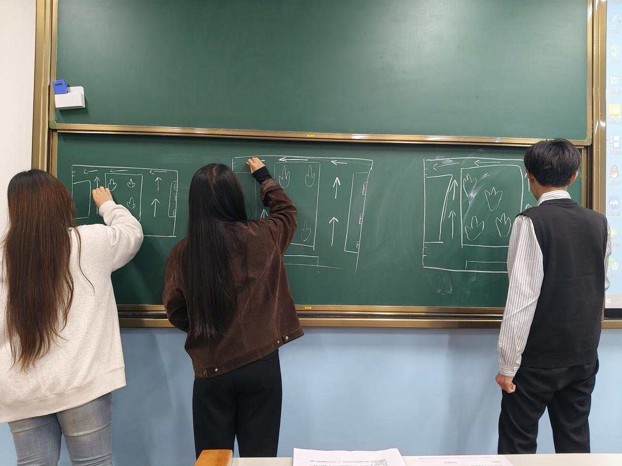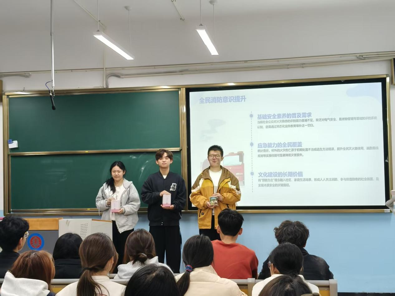 活动打破传统宣讲模式,以沉浸式体验推进:科普宣讲环节紧扣校园实际,主持人点明世界消防日意义,结合教室、宿舍场景指出违规用电、易燃物堆积等隐患,再通过PPT拆解灭火器“提、拔、握、压”操作要领,强调“黄金逃生间”的关键作用;互动体验环节里,“隐患情景判一判”中同学们踊跃抢答“充电器长期插电”“楼道堆纸箱”等场景风险点,“逃生路线我来画”则以小组合作形式勾勒路线、标注安全出口,经点评优化后深化了逃生规划认知。