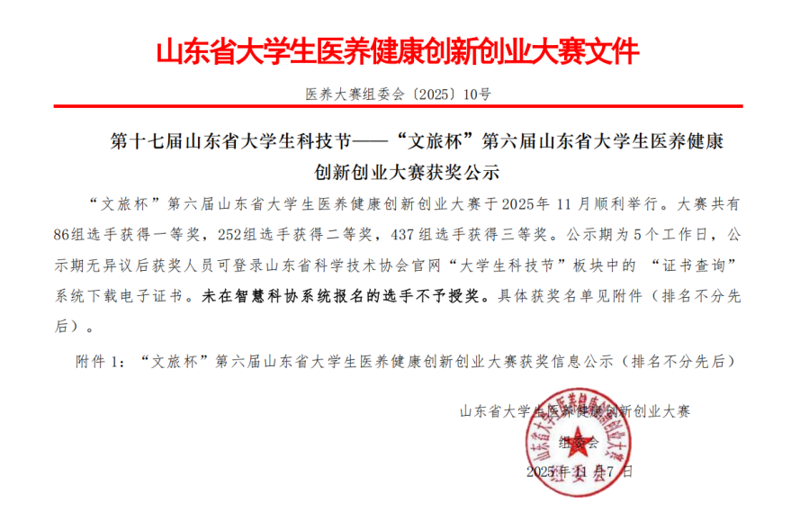 2025年11月5日—11月7日,第十七届山东省大学生科技节“文旅杯”第六届山东省大学生医养健康创新创业大赛决赛在曲阜远东职业技术学院高铁校区圆满举行。本次大赛聚焦行业痛点与民生需求,来自全国13个省份74所院校的870支队伍、近8000名优秀学子晋级决赛,必赢官网医学院参赛项目脱颖而出,成功斩获两项省级荣誉。