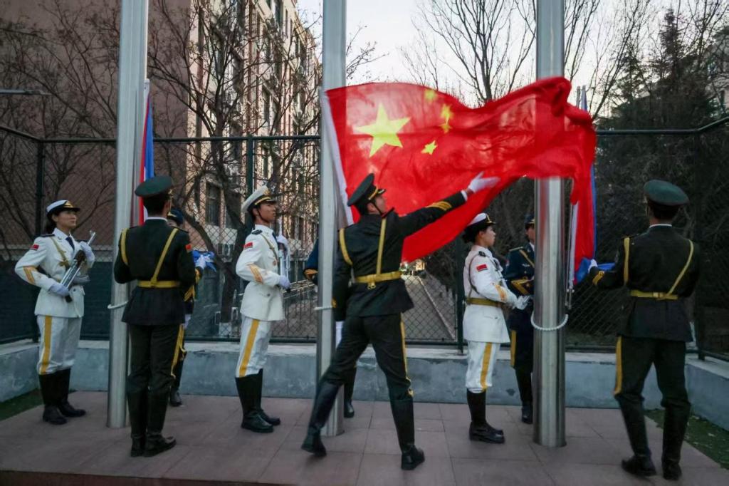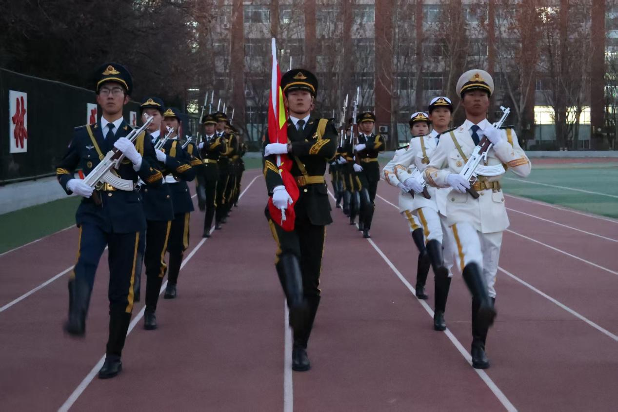 晨光熹微,全体师生着装整齐、精神饱满,有序列队。兄弟连国旗中队迈着铿锵步伐护送国旗入场,气势昂扬。雄壮国歌奏响,五星红旗冉冉升起,师生肃立行注目礼,爱国情怀与医者使命在晨光中交融。