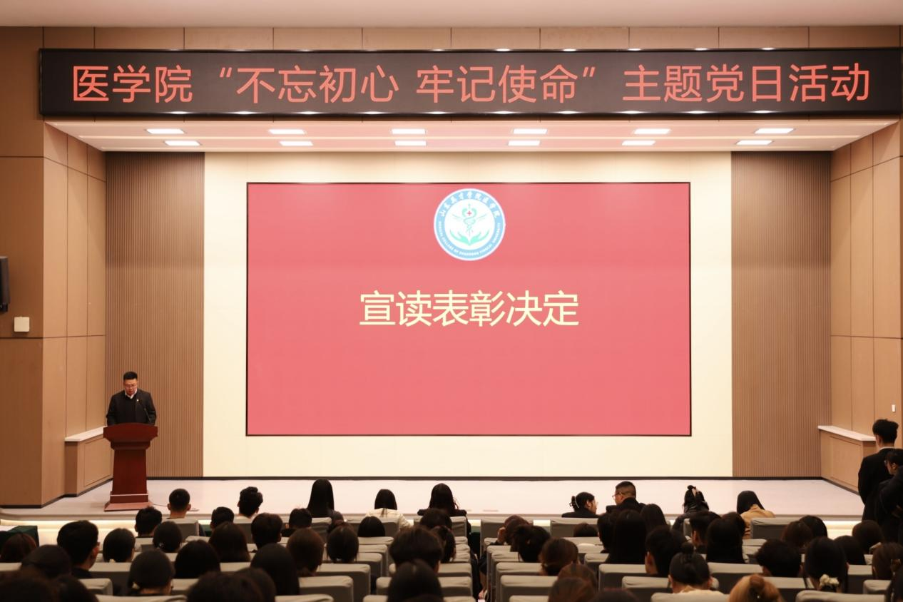 为深入学习贯彻党的二十大及二十届四中全会精神,总结年度红色教育实践成果,凝聚师生党员奋进力量,12月11日,医学院党总支于学术报告厅开展“不忘初心 牢记使命”主题党日活动暨2025年医学院党总支红色教育实践活动表彰大会。医学院党总支副书记张国栋、全体党员及学生代表共同参加。