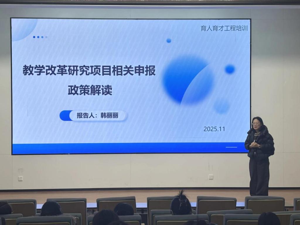 会上,韩老师首先围绕申报周期、研究周期及结项要求三大核心要素展开解读,详细梳理了申报的时间节点、研究周期的合理规划方法,以及结项时需满足的成果要求、材料规范等关键内容,帮助教师们厘清项目推进的时间脉络与核心标准。此外,针对教师们高度关注的奖励资助办法与推荐限额问题,进行了重点说明。随后,韩老师鼓励教师们立足教学实际,紧扣政策导向与产业需求,挖掘具有创新性、实用性的研究课题。
