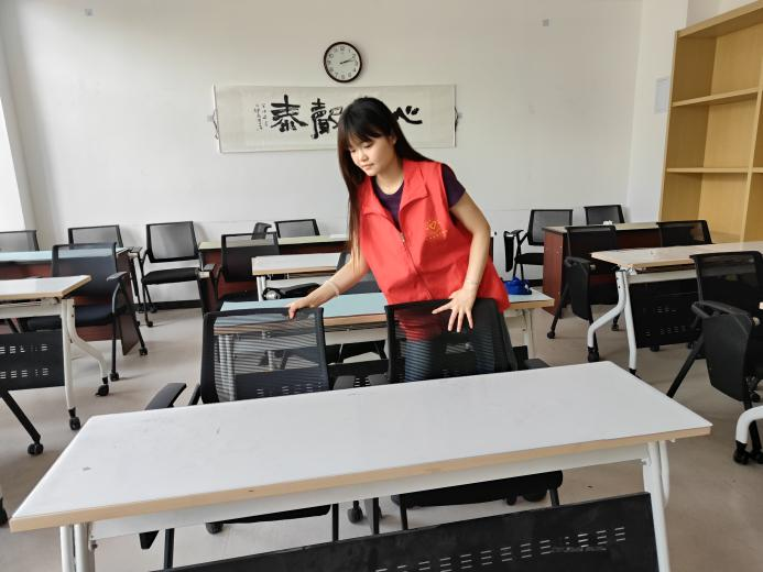 图为实践团成员摆放桌椅