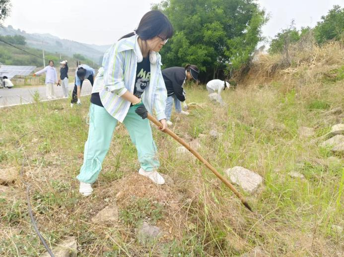 面对其它杂草,志愿者们手持耙子进行除草,清除杂草可以让环境更加整洁、美观,保证环境质量。