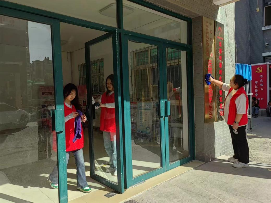 实践团成员投入到社区卫生工作当中,开展擦门窗玻璃以及垃圾分类活动。同时,居民们也了解到环保的重要性。