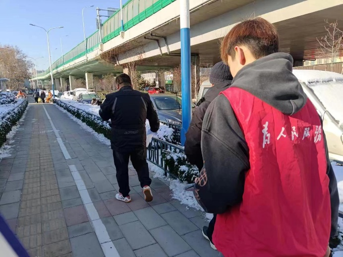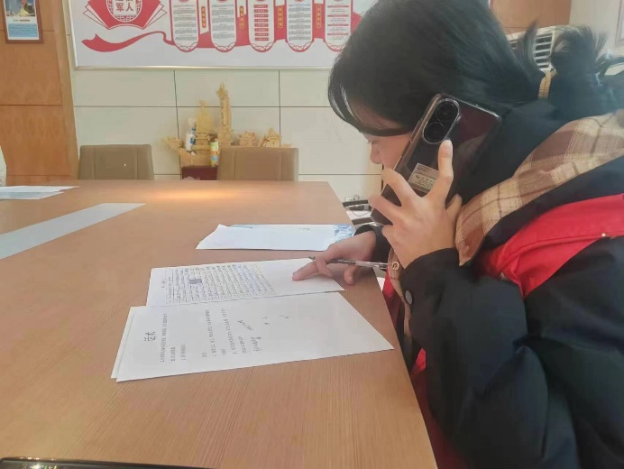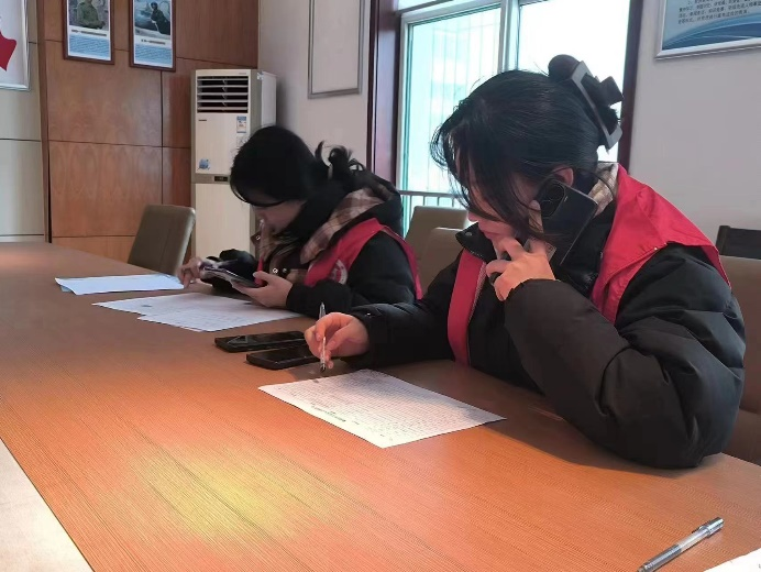 志愿者们根据负责人分发名单上的联系电话与独居老人取得联系,告知近日路滑,尽量不要出门,有需要可寻求儿女,邻居,或者拨打社区电话寻求帮助等事件。