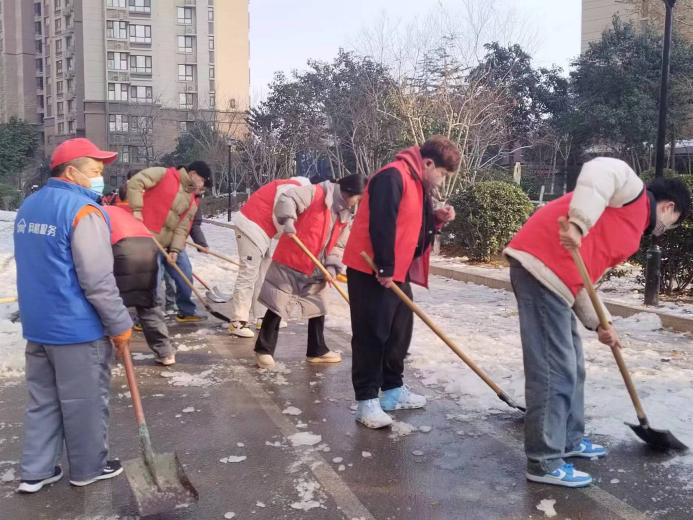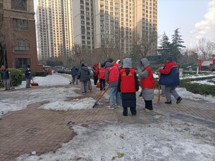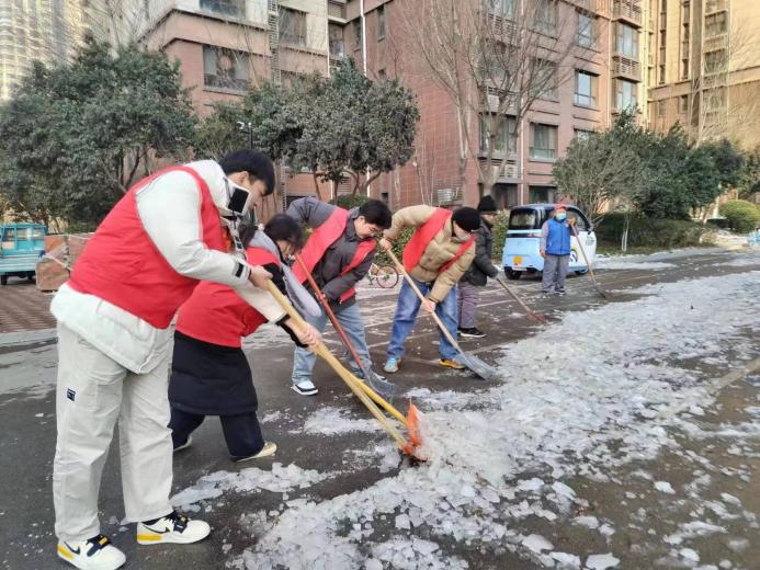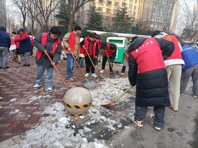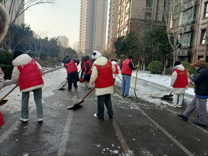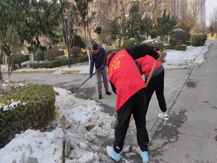 冬季下雪量大,志愿者们同社区工作人员一起铲雪为社区人民的安全带来一定的保障,防止人们出现安全隐患,尤其是上了年纪的老人。