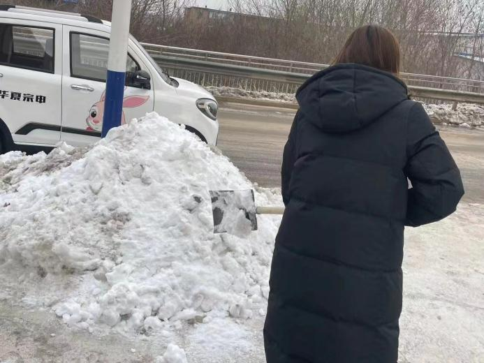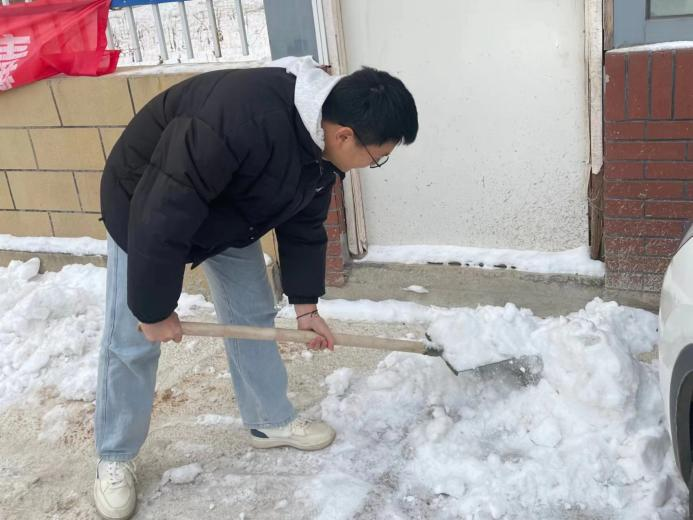 在锄雪过程中,志愿者们自己分配好工作,几个人锄雪,几个人运雪,很快村委会周边便干净了起来。