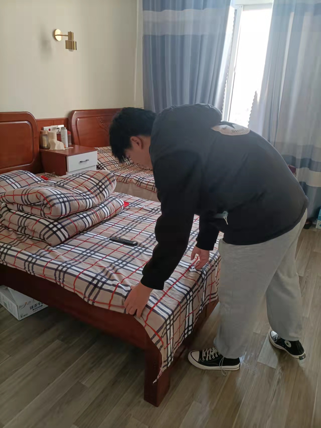 图为志愿者们整理床铺