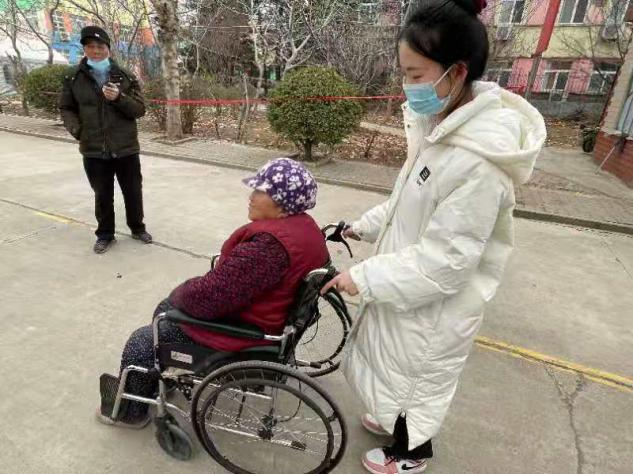 图为志愿者推老人散步