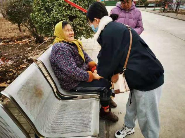 图为志愿者与老人打招呼