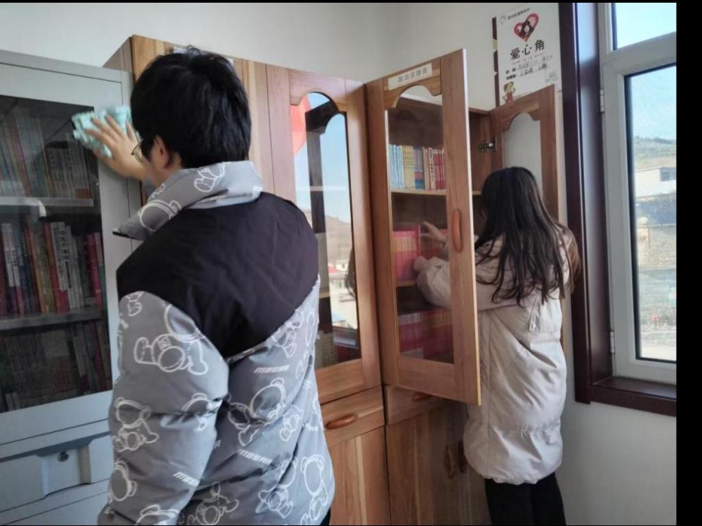 完成第二项活动项目后,实践团成员开始第三项活动“清洁居民阅读图书区域”。