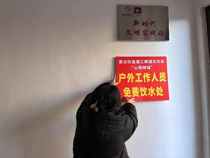 切身理解到户外工作人员的实际需求,社区建立免费饮水处,志愿者们正在挂免费饮水处指示牌确保更多的户外工作人员能看到。