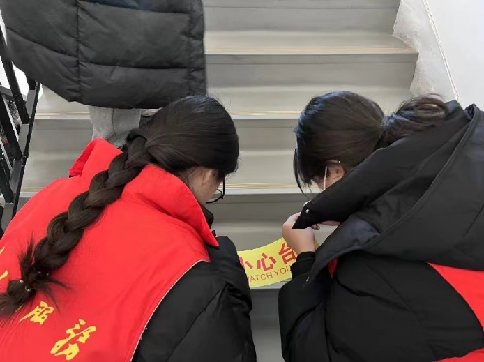 志愿者们为防止楼梯踩踏事件在每个楼梯台阶处贴上“小心台阶”的指示标语,提醒人们注意脚下。