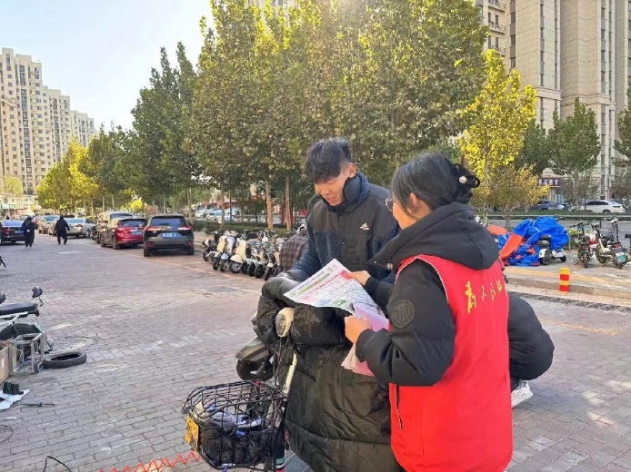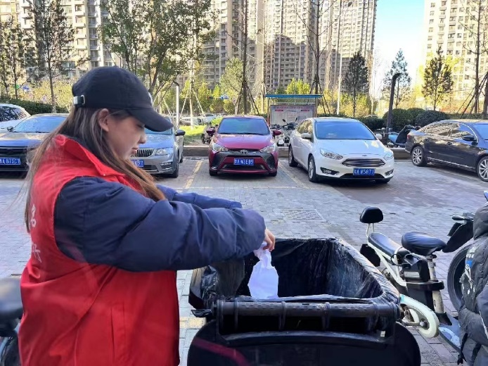 最后,学生志愿者为社区居民普及垃圾分类知识,免费发放垃圾分类知识传单,并且号召大家绿色低碳出行,创造健康美好环境。