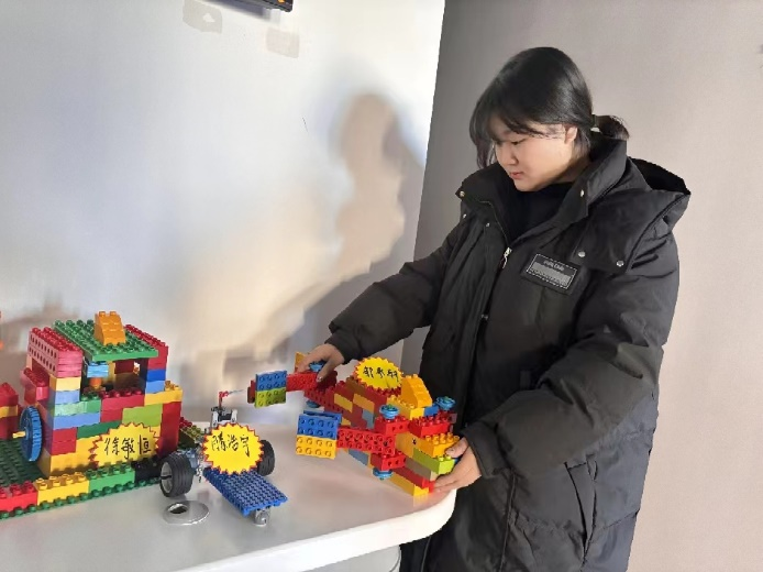 志愿者们在参观同学们积木搭建作品的同时也为这些作品进行了清洁摆放。