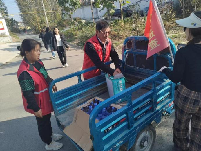 在志愿者休息时,社区负责人提供了矿泉水,志愿者一同分发每一个人。