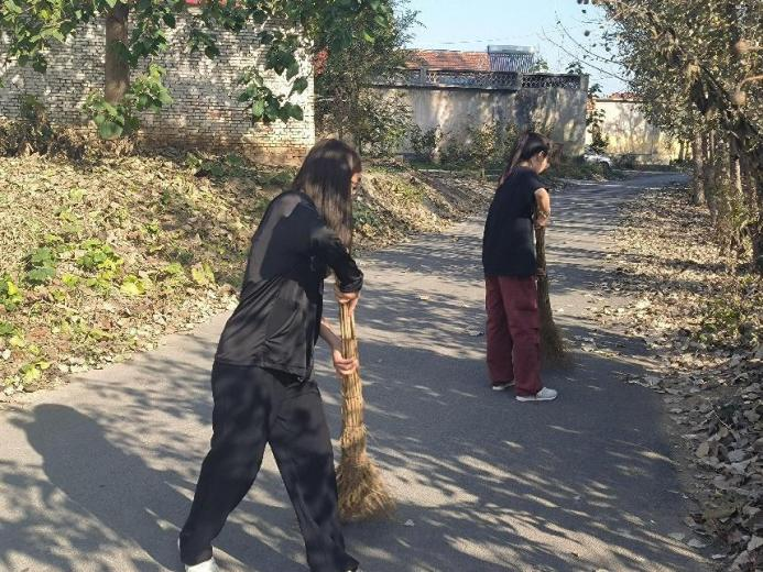 清理杂草结束后志愿者们积极拿起大扫帚清扫社区街道。很快街道被打扫的干净整洁,志愿者心中充满自豪感和荣誉感。