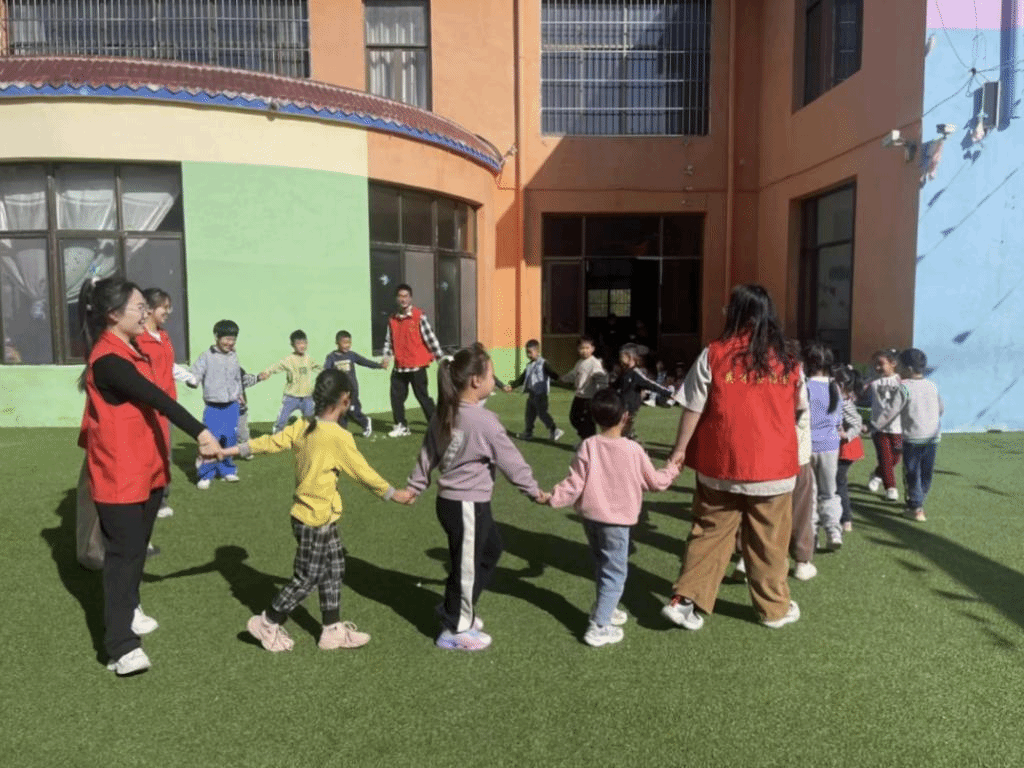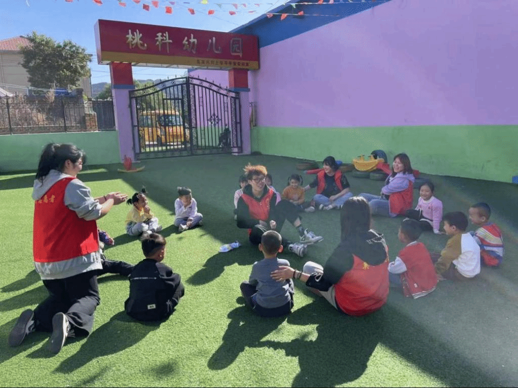 在满足老年人日常生活需求的同时,也给孩子们提供娱乐空间。下午14点,在港沟街道桃科村的一群孩子正和志愿者老师围坐在一起做游戏。