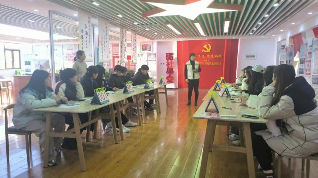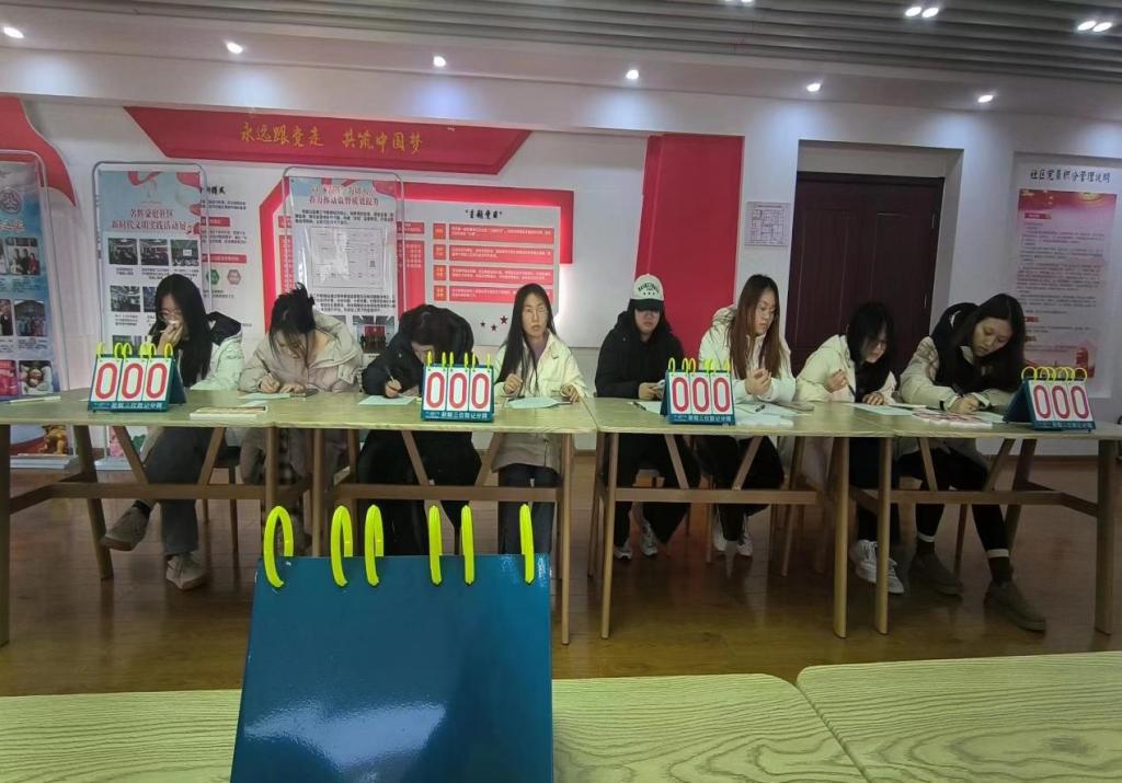 实践团成员领取完物品后,两两分组进行该社区“参与垃圾分类,争做文明市民”竞赛活动。