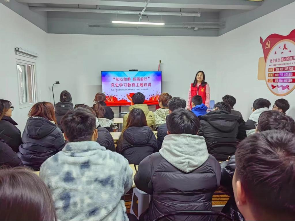 在到达社区之后,大学生志愿者们在社区居委会的门前进行了集体合照。随后在老师的安排下,首先进行了红色文化的学习并且一同观看红色文化的相关影像。培养大学生志愿者的红色文化知识储备,学习红色文化精神,发扬爱国精神。