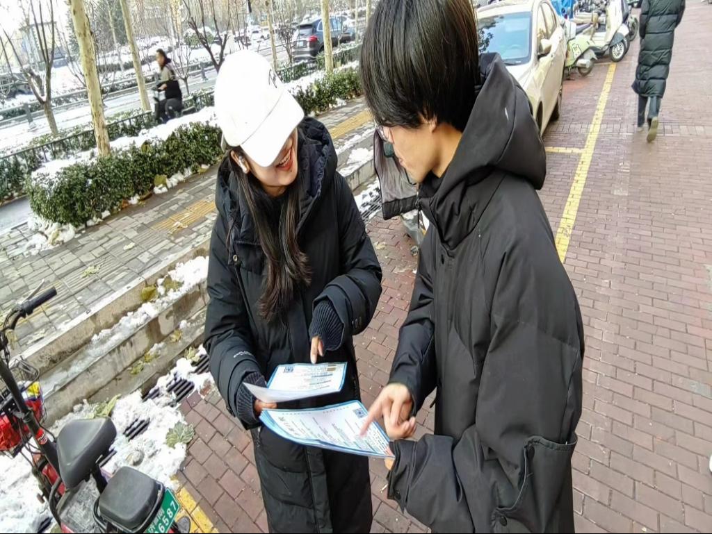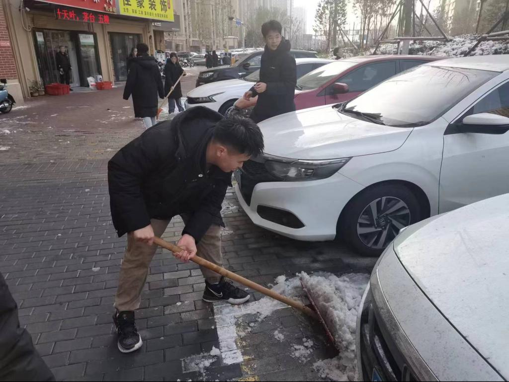 在观看红色文化影像结束后,老师将大学生志愿者们分为两组,并且两组分别负责不同的志愿服务项目。一组负责除冰扫雪清理道路保护社区环境,而另一组负责发放反诈骗宣传单并且要向社区居民宣传反诈骗相关知识,响应国家号召,为社会做出力所能及的事情。