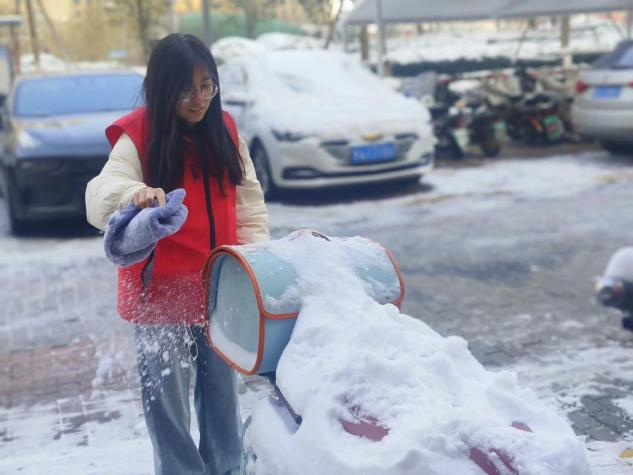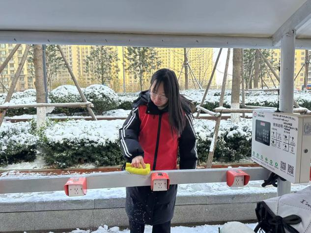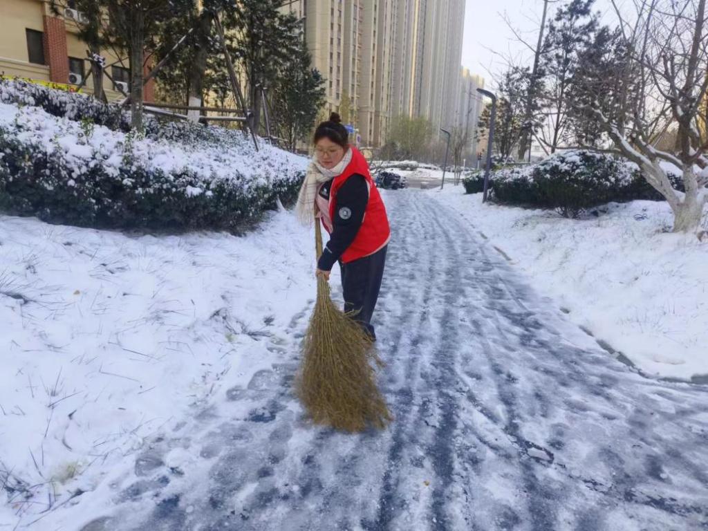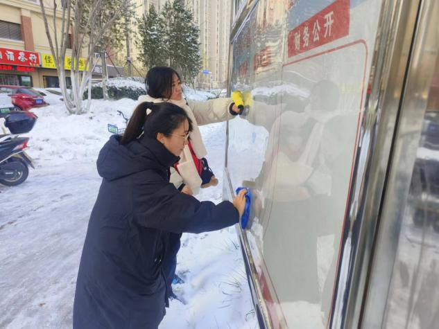 在此次实践中,志愿者分成三组对其进行服务,第一组的志愿者们积极参与到对中老年人的培训的场景布置中。第二组的志愿者对社区宣传栏等进行打扫清理。第三组对社区道路进行清雪。