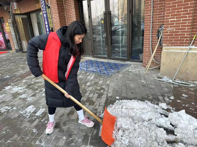 三组手拿工具对社区道路上的积雪进行处理与消除,大雪过后路面上积满了雪和冰大大不利于居民的出行,志愿者们听到这就立马拿起工具对其进行清除工作。