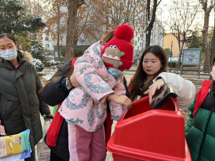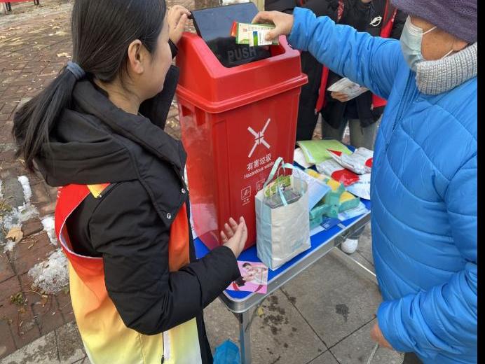 志愿者们向居民宣传垃圾分类的重要性和方法,引导居民正确投放有害垃圾和可回收物。在小区有害垃圾收集点,多名居民积极参与,将家中的废旧电池、废荧光灯管、过期药品等有害垃圾投入回收点。