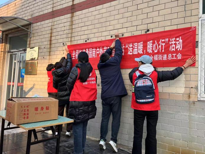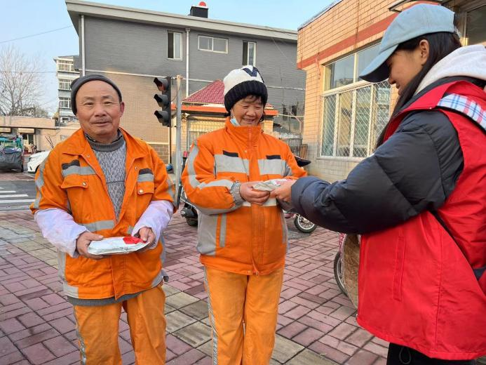 在活动现场,志愿者们与工作人员共同搭建爱心摊位,为环卫工人、外卖小哥、交警等户外工作人员提供热水和爱心暖贴,让在寒冷的冬天里劳动的人民们感受到社区的温暖和关爱。