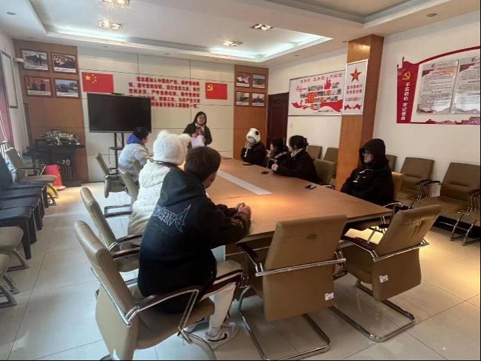 社区负责人带领志愿者们在二楼开会讲解实践内容,一组跟随负责人外出前往居民家里进行开户,二组在二楼通过手机通讯关怀居民。