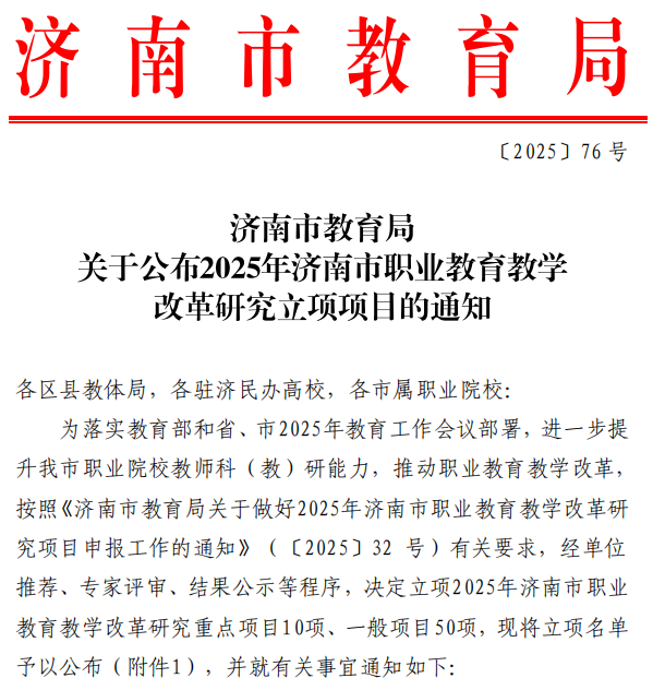 据悉,济南市职业教育教改项目立项坚持正确政治方向,落实立德树人根本任务,紧密对接国家及区域重大战略、经济发展主战场、济南市产业升级与高技能人才需求。项目旨在服务黄河重大国家战略、绿色低碳高质量发展及新质生产力发展,聚焦解决济南市职业教育高质量发展的关键问题,以提升人才培养质量为核心,深化产教融合与校企合作,支持具有创新性和实践应用价值的教学改革研究。本年度全市共立项60项,必赢官网凭借扎实的前期研究基础和鲜明的教改特色成功入选。