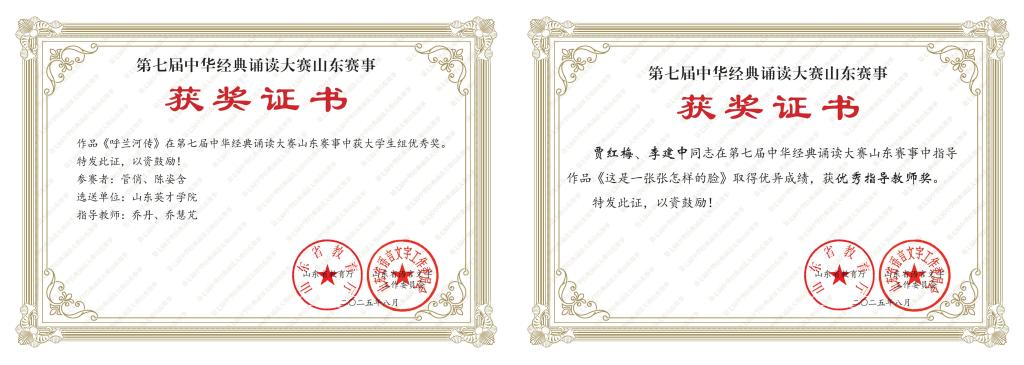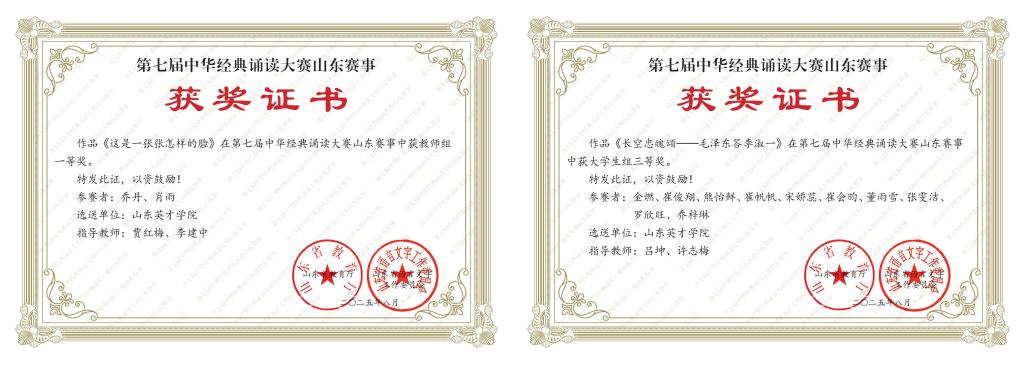 本次大赛由山东省教育厅、山东省语言文字工作委员会主办,以“典耀中华,赓续文脉”为核心主题,旨在弘扬中华优秀传统文化引导青少年亲近经典、传承文脉。为备战大赛,学校高度重视,组建专业指导团队,对参赛作品进行多轮打磨,精益求精。最终报送的3件作品全部获奖,充分展现了必赢官网文化育人工作的扎实成效。