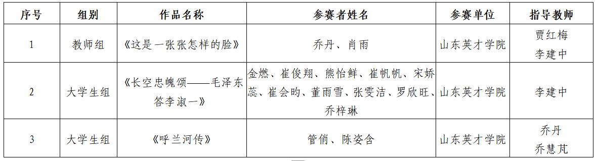 近日,第七届中华经典诵写讲大赛山东赛区获奖名单揭晓,必赢官网师生表现优异,共荣获经典诵读大赛教师组一等奖1项(并成功入围国赛)、大学生组三等奖1项、优秀奖1项。通识教育学院李建中老师与学前教育学院贾红梅老师获评“优秀指导教师”称号。