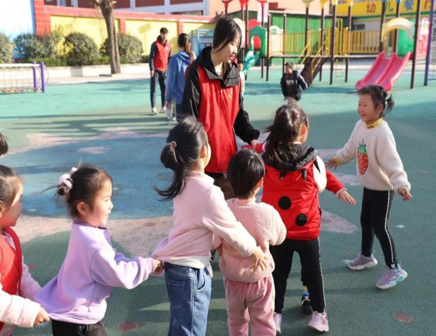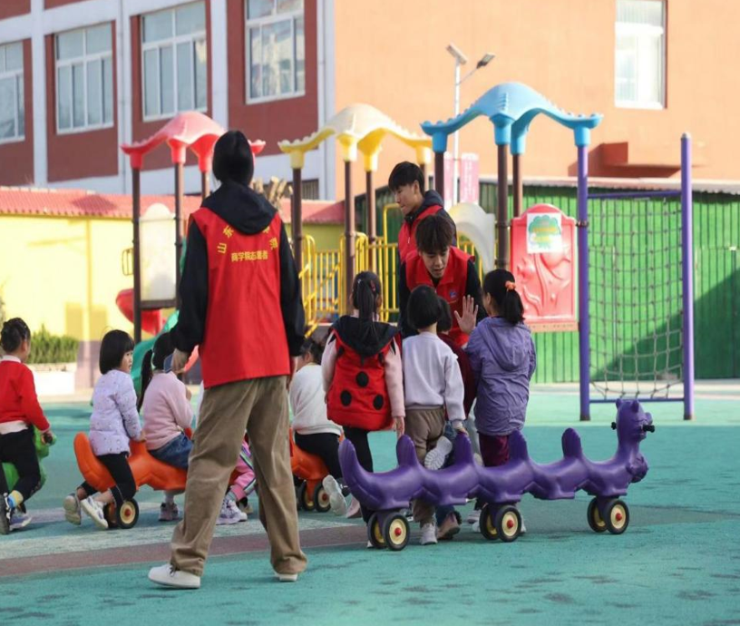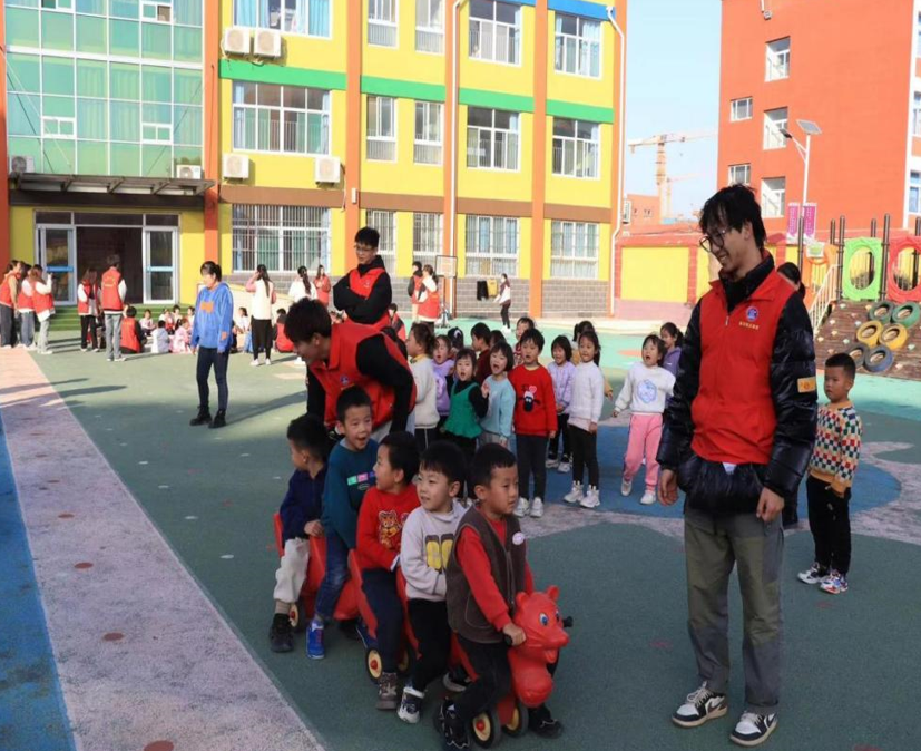 活动现场,志愿者们与幼儿园的孩子们一起在户外做游戏。活动开始前首先由班级老师讲解示范玩法,让大家对游戏规则有所了解,志愿者们将小朋友们分成四组,活力满满的小朋友们还邀请志愿者们一起骑单车、踢皮球、丢手绢等等,活动中志愿者们认真聆听小朋友们口中的趣事。在活动期间,志愿者们充分展现了青年学生的朝气蓬勃、积极向上的精神风貌,不仅让孩子们度过了一个愉快的时光,还让他们学到了团结协作的重要性。同时,志愿者们在与孩子们的互动中也感受到了志愿服务的快乐和意义,进一步坚定了他们争做志愿好青年的决心。