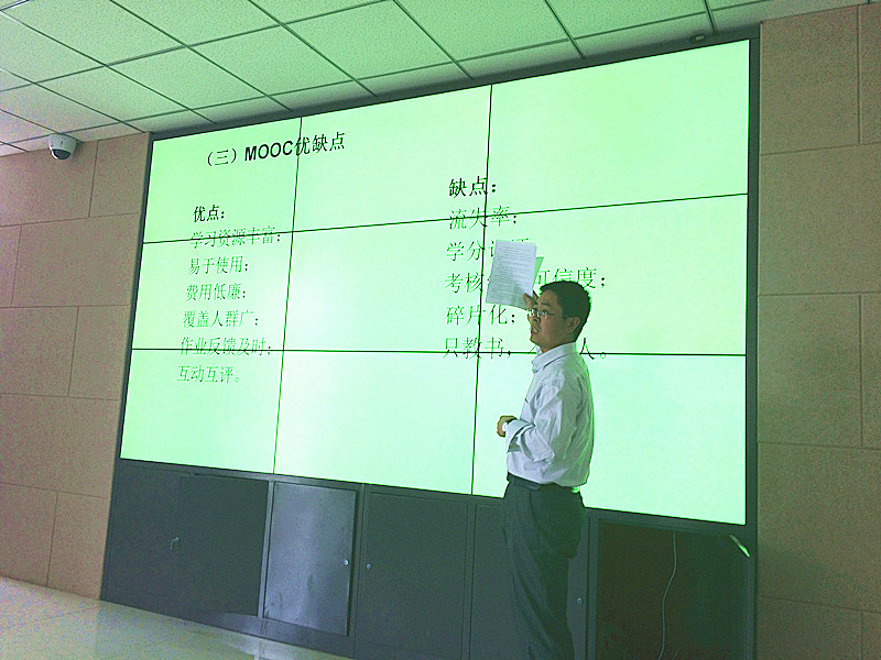 李强主任结合自己教学改革的实践经验和研讨学习心得,向教师们介绍了MOOC的发展历程、模式、特点,并详细讲解了“基于MOOC的混合式教学”的三个关键环节,即前端分析——学习活动设计——评价设计。