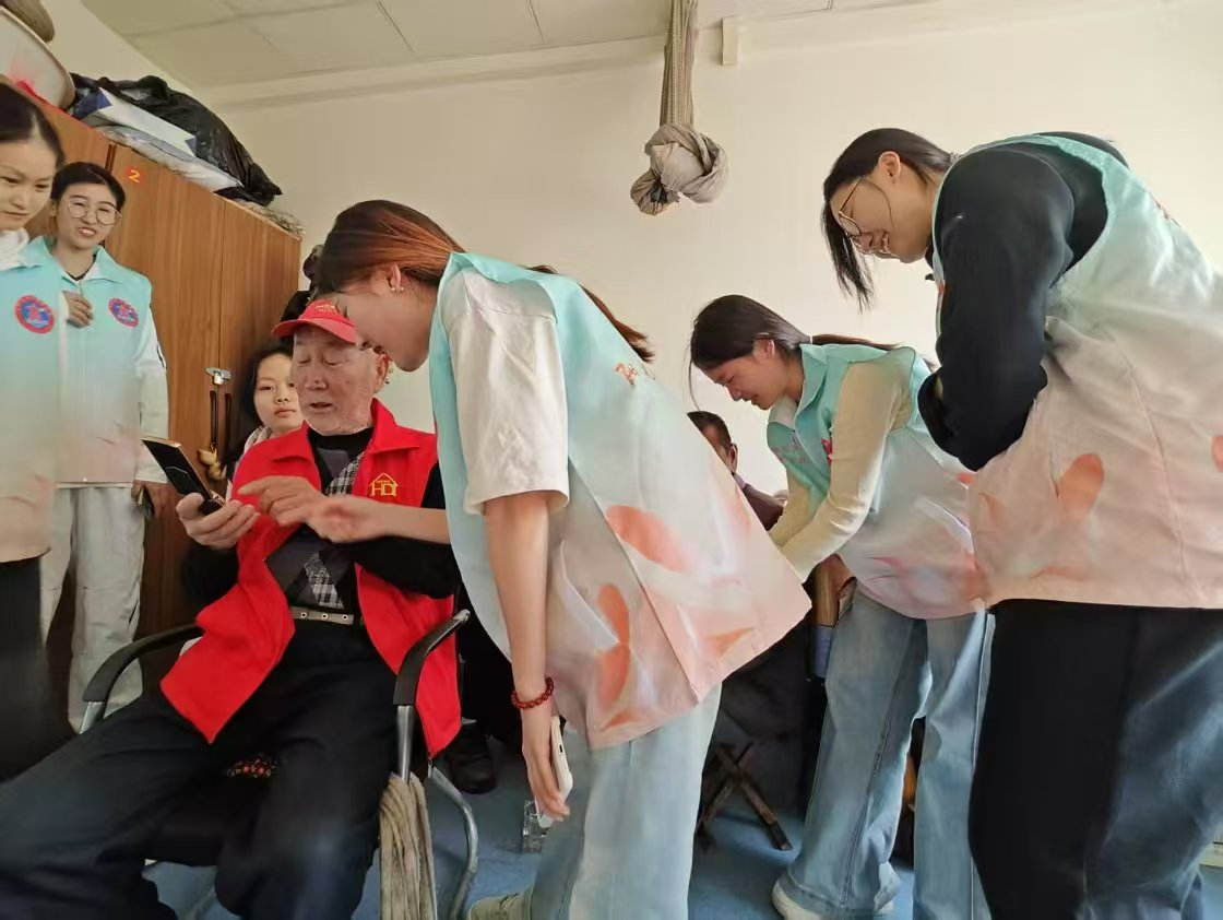 与此同时,其他女生陪老人聊天,耐心倾听他们讲述过去的故事,从青春岁月的奋斗到生活中的点滴琐事,老人倾诉着,女生们专注地聆听着,不时给予回应。