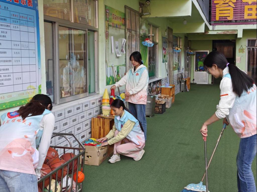 活动接近尾声,女大学生们没有停下脚步,她们整理起玩具,清扫地面。