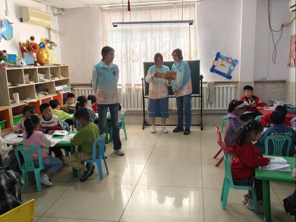之后女大学生们领着小朋友逐字逐句朗读,清脆的童声与温柔的引导声交织。她们耐心纠正发音,鼓励小朋友大声读出来,小小的书本仿佛成了通往知识海洋的船票。